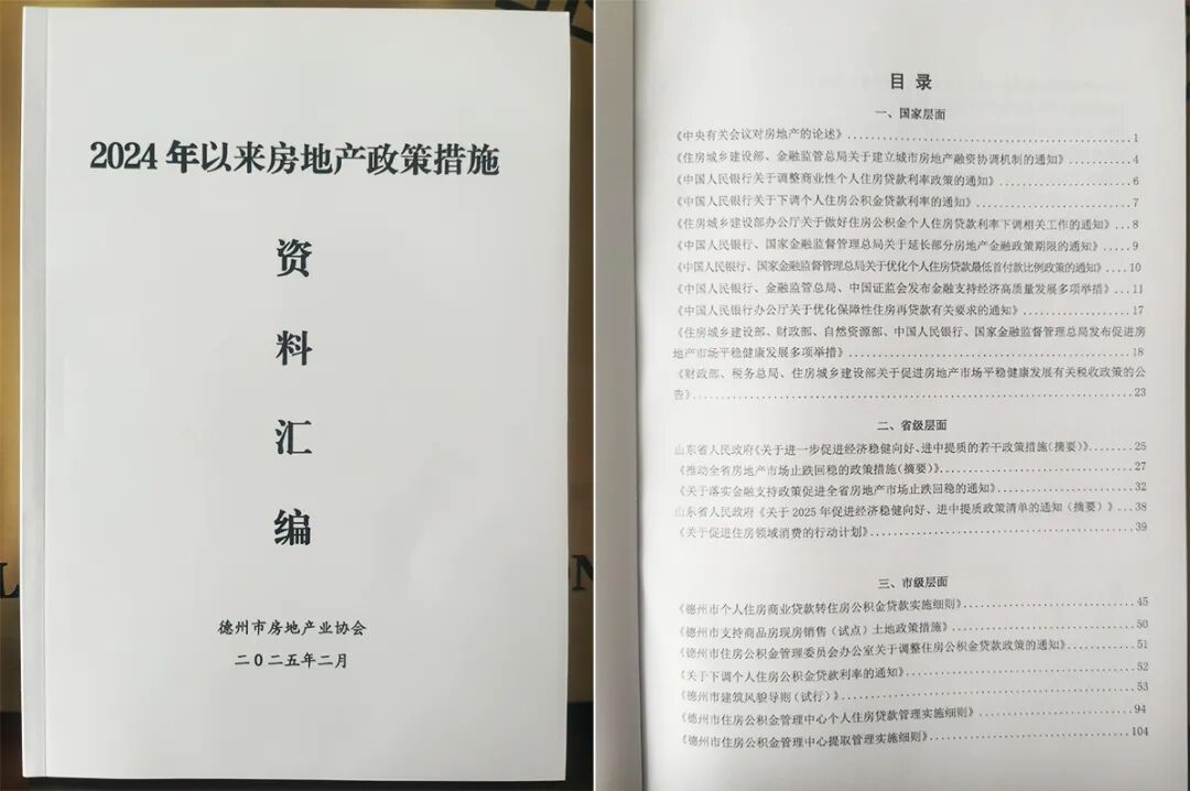 会议首先由协会党支部书记张云发宣读了《关于表扬2024年度优秀会员单位和优秀联络员及优秀项目的通报》。授予45家会员企业“优秀会员单位”称号,表彰26名优秀联络员和11家在“百城千企商品房促销”“方便看房”两项活动中表现突出的会员企业,并颁发牌匾和证书。会议一致了通过增补两名副会长、一名常务理事的议案。德州德达地产集团有限公司董事长刘永强、德州人和置业有限公司董事长张建军由常务理事晋升为副会长,山东安德投资发展集团有限公司董事长龚红民由会员晋升为常务理事。德州房协会长魏建国为他们颁发牌匾。魏建国会长代表第三届理事会作2024年工作情况和2025年主要工作任务的报告,从五个方面总结回顾了去年的工作情况。过去一年,协会在促进房地产市场止跌回稳、提升住宅品质、加强行业自律等方面取得显著成绩,特别是在组织论坛培训、开展促销活动、树立品质标杆、当好政府参谋助手等方面亮点纷呈。面对2025年房地产市场的挑战与机遇,报告提出了深入抓好政策学习宣传、认真做好市场调研、广泛开展促销活动、大力推进好房子建设、高度重视团结合作、切实加强行业自律等六大工作要点。希望全体会员充满信心、保持耐心,顺势而为、积极作为,共同为德州市房地产市场的止跌回稳和健康发展贡献力量。刘希胜监事长作协会2024年财务收支监督情况报告。会议特别邀请市房产管理中心副主任史瑞松、市住房公积金管理中心副主任王鹏,详细解读了当前国家和省特别是德州市促进房地产止跌回稳的一系列利好政策。同时,会议印发了市房协编辑整理的《2024年以来房地产政策措施资料汇编》,听后看后大家一致反应非常管用和“解渴”。