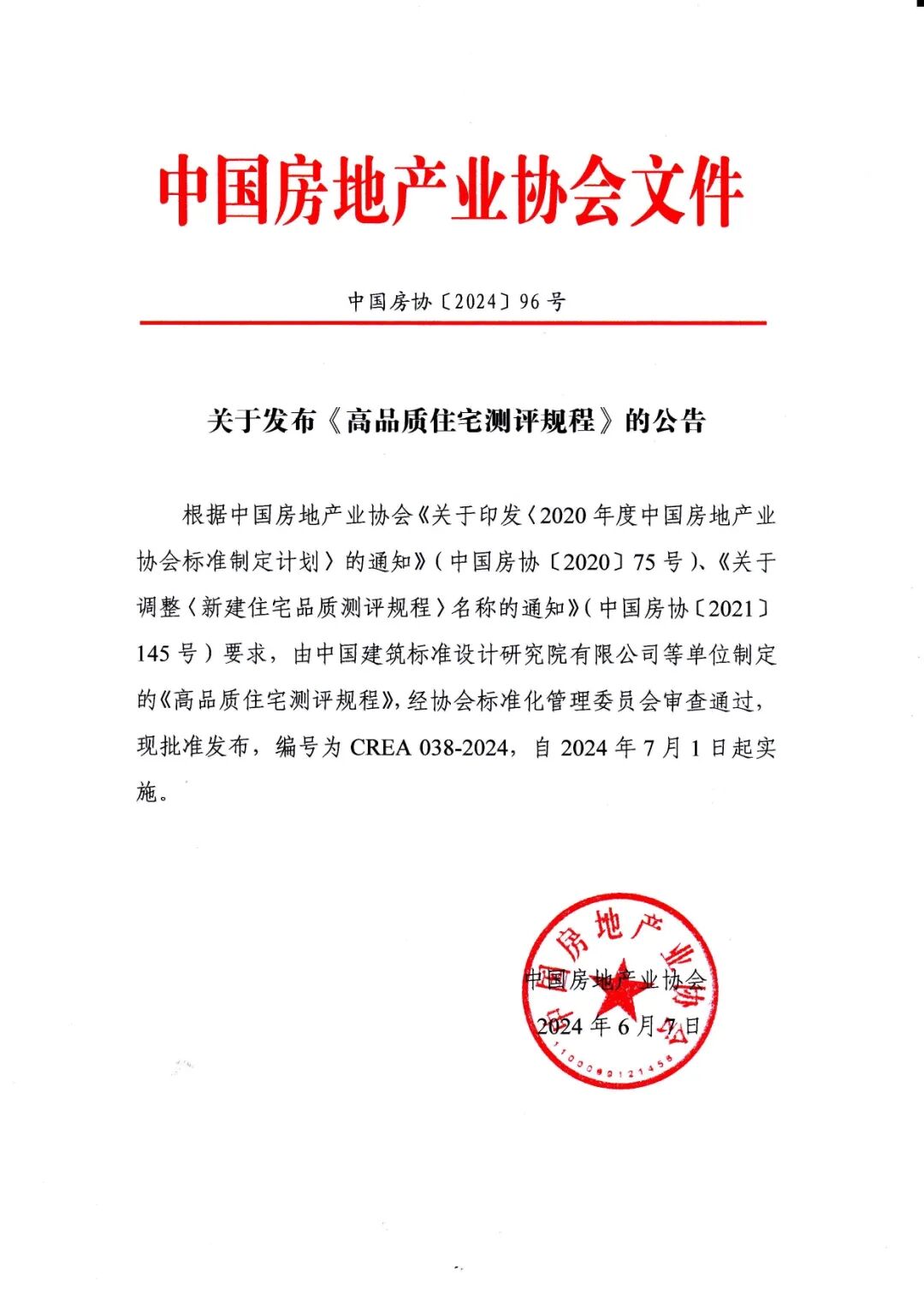 6月7日,为促进房地产行业高质量发展,全面引导行业提升住宅品质,中国房地产业协会发布由中国建筑标准设计研究院有限公司等单位制定的《高品质住宅测评规程》(编号CREA 038-2024)。《高品质住宅测评规程》在总结过往经验、参考国外标准、广泛征求意见基础上,结合新时期居民生活方式的新需求编制而成,旨在推动全生命周期住宅设计理念落地,为人民群众提供优质住宅产品,指导“高品质住宅”工程建设,为行业“高品质住宅”的判定提供依据。高品质住宅测评首批项目是经企业自愿申报,符合《高品质住宅测评规程》相关设计要求,入围“高品质住宅”。去年7月,山东在全国第一个出台省级层面高品质住宅政策措施,全省各地市积极谋划布局高品质住宅项目,高品质住宅成果“百花齐放”。省房协积极引导企业参与高品质住宅建设,助力房地产市场健康平稳高质量发展。