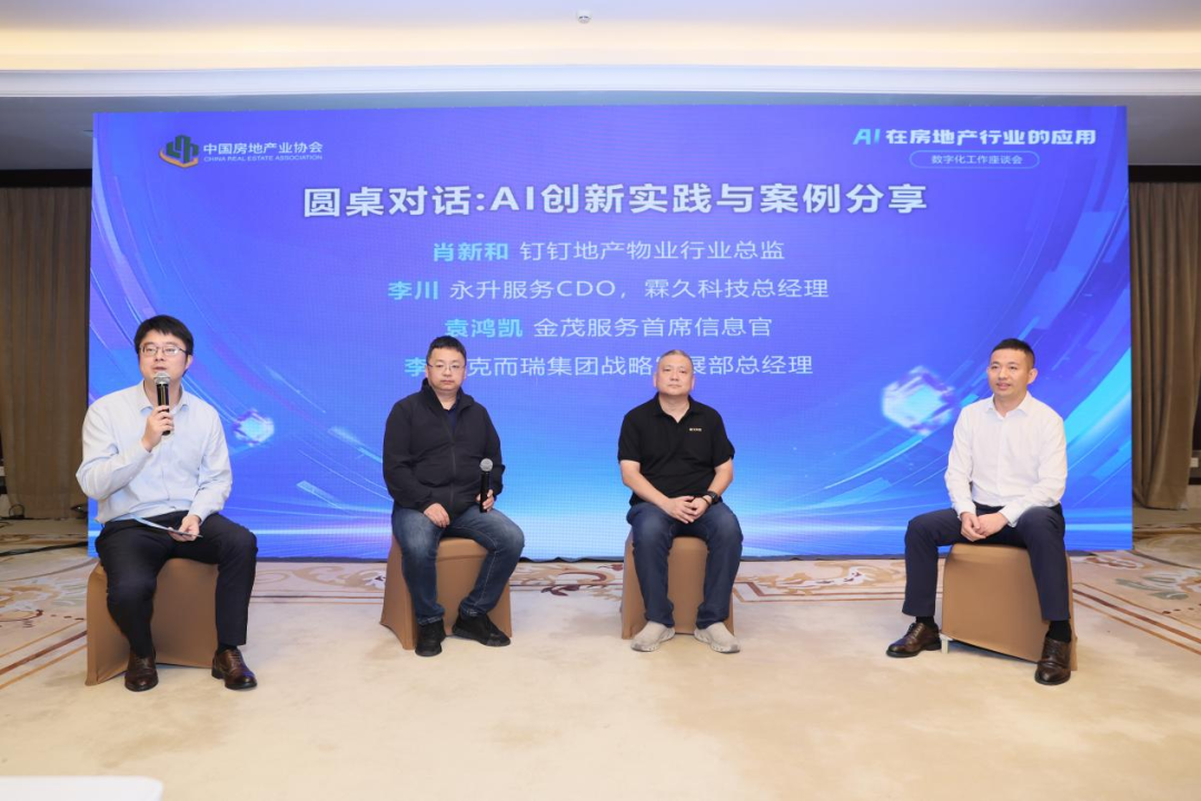 克而瑞集团战略发展部总经理李琛主持圆桌论坛环节,钉钉(中国)地产物业行业总监肖新和、永升服务CDO、霖久科技总经理李川、金茂服务首席信息官袁鸿凯等嘉宾就AI落地挑战、投入产出评估等话题展开讨论,认为数据孤岛、业务标准化和组织变革是AI落地的核心难题,需行业共同努力推动数据共享与标准制定。