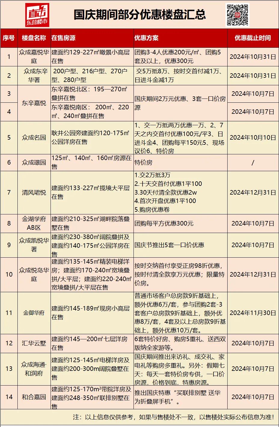 国庆期间,众成地产集团旗下众成璟园、众成名园、悦岛华庭项目都拿出了特价房源;东辛嘉悦、凯悦华庭项目推出了一口价房源;众成嘉悦华庭、金湖学府项目有团购每平米优惠政策;东辛华著、清风珺悦项目也拿出来交几万抵几万的优惠政策,真的是抄底价了。