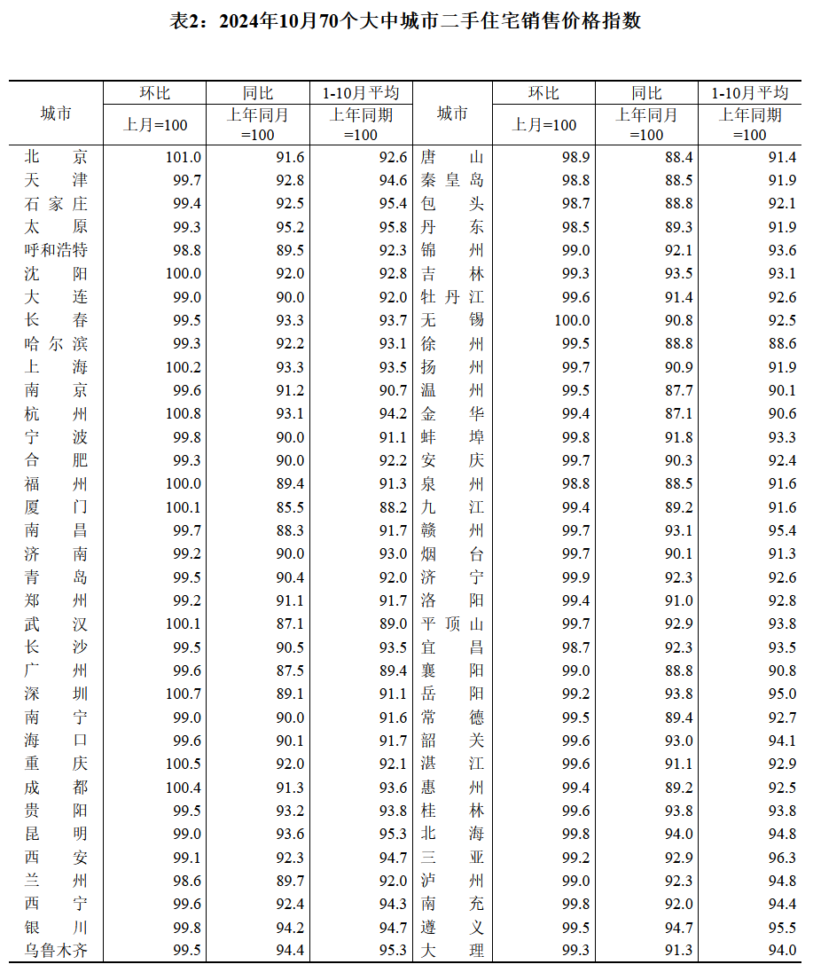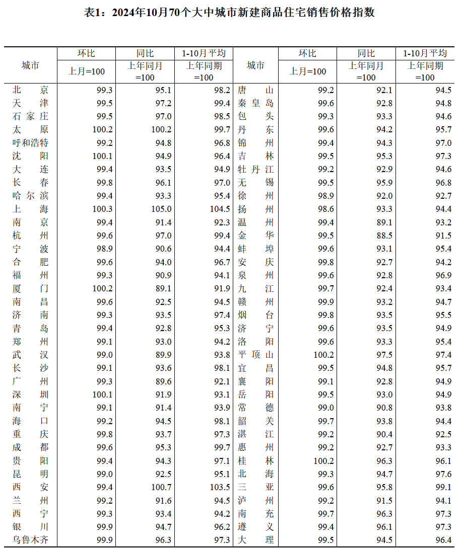 随着行业增量政策不断落地,10月房价释放了积极信号。国家统计局发布的《70个大中城市商品住宅销售价格变动情况》显示,2024年10月份70个大中城市中新建商品住宅和二手住宅销售价格环比上涨城市分别有7个和8个,比上月分别增加4个和8个;同比上涨城市分别有3个和0个,比上月分别增加1个和持平。整体来看,10月房地产市场预期进一步改善。70个大中城市中,各线城市商品住宅销售价格环比降幅收窄或转涨、同比降幅趋稳。根据国家统计局数据,10月份一线城市新建商品住宅销售价格环比下降0.2%,降幅比上月收窄0.3个百分点;二三线城市新建商品住宅销售价格环比均下降0.5%,降幅均比上月收窄0.2个百分点。同比方面,一线城市新建商品住宅销售价格同比下降4.6%,二、三线城市同比分别下降6.0%和6.6%。从各城市表现来看,新建商品住宅价格方面,根据国家统计局公布的数据,10月份上海环比涨幅0.3%,位列涨幅第一位;太原、平顶山、桂林和厦门以0.2%的涨幅紧随其后。扬州领跌,环比跌幅为1.4%,徐州和宁波以1.1%的跌幅处于并列第二位。