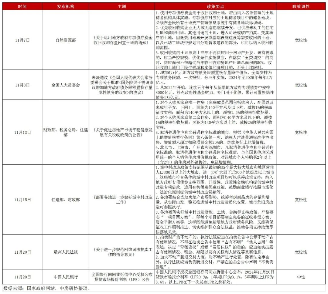 2024年11月,我国房地产政策利好持续释放。中央层面,全国人大常委会批准增加6万亿元地方政府债务限额置换存量隐性债务,且从2024年开始,连续五年每年从新增地方政府专项债券中安排8000亿元专门用于化债,累计可置换隐性债务4万亿元;自然资源部发文支持地方政府运用专项债券资金收购存量闲置土地;财政部、税务总局、住建部联合发布房地产契税、土地增值税等税收优惠政策;住建部进一步加大城中村改造政策支持力度等,持续助力房地产市场止跌回稳。地方层面,本月地方出台房地产调控政策70条,其中,宽松性政策61条、中性政策7条、紧缩性政策2条。从调控内容来看,北上广深四个一线城市和重庆、哈尔滨等重点二线城市纷纷跟进取消普通住房标准并落实住房交易税收优惠政策,大部分二三线城市则继续围绕房地产市场供需两端发力,如优化住房信贷政策、加大住房公积金政策支持、推动住房“以旧换新”、鼓励房票安置、加大房地产融资支持、加大高品质住房供给、优化房企预售监管等。本期报告主要对11月房地产行业政策进行梳理,并作解析。