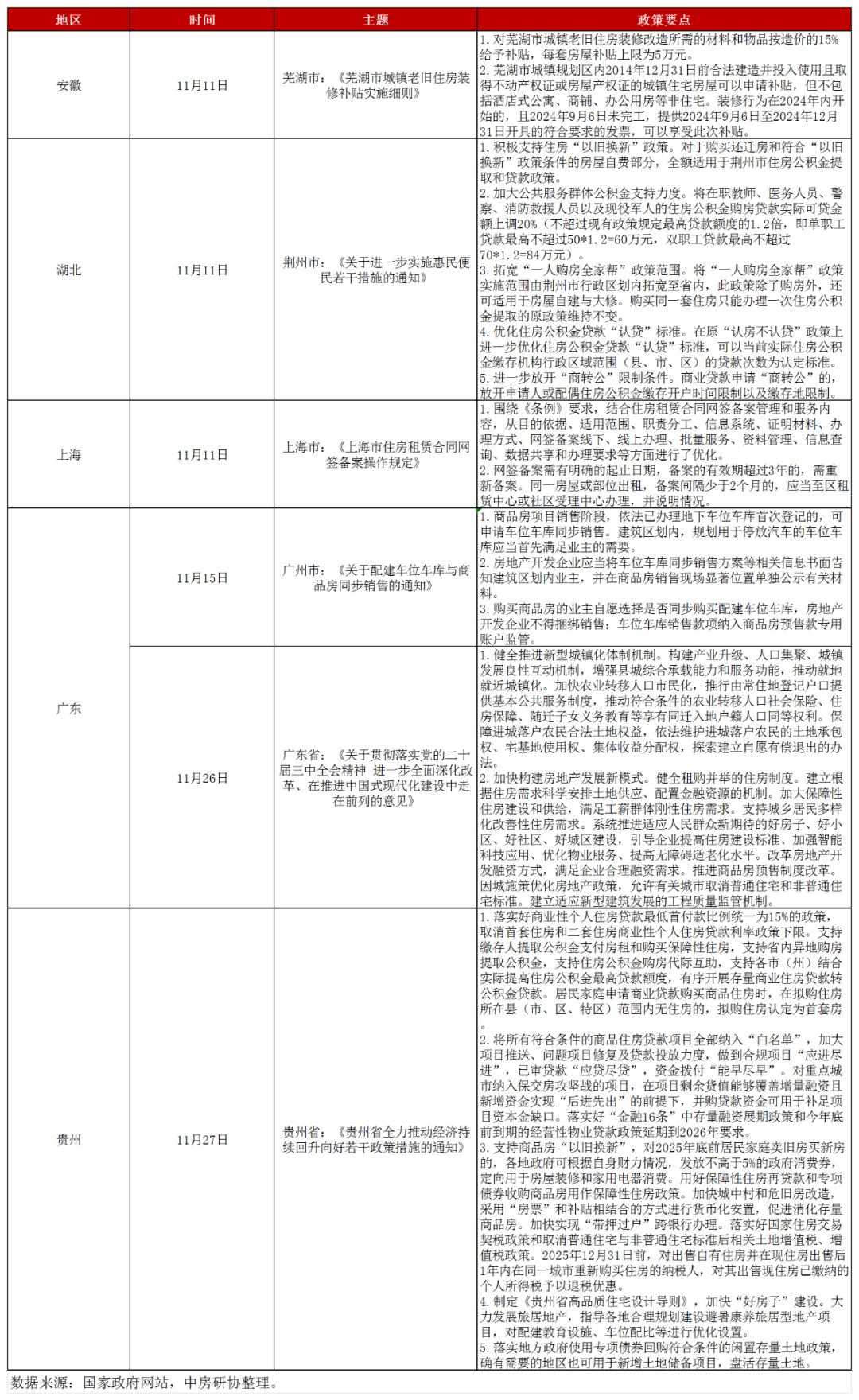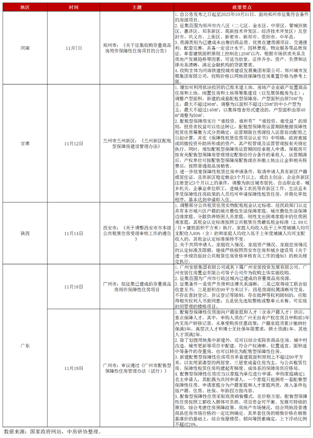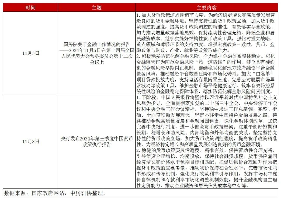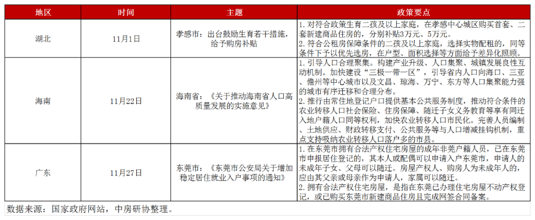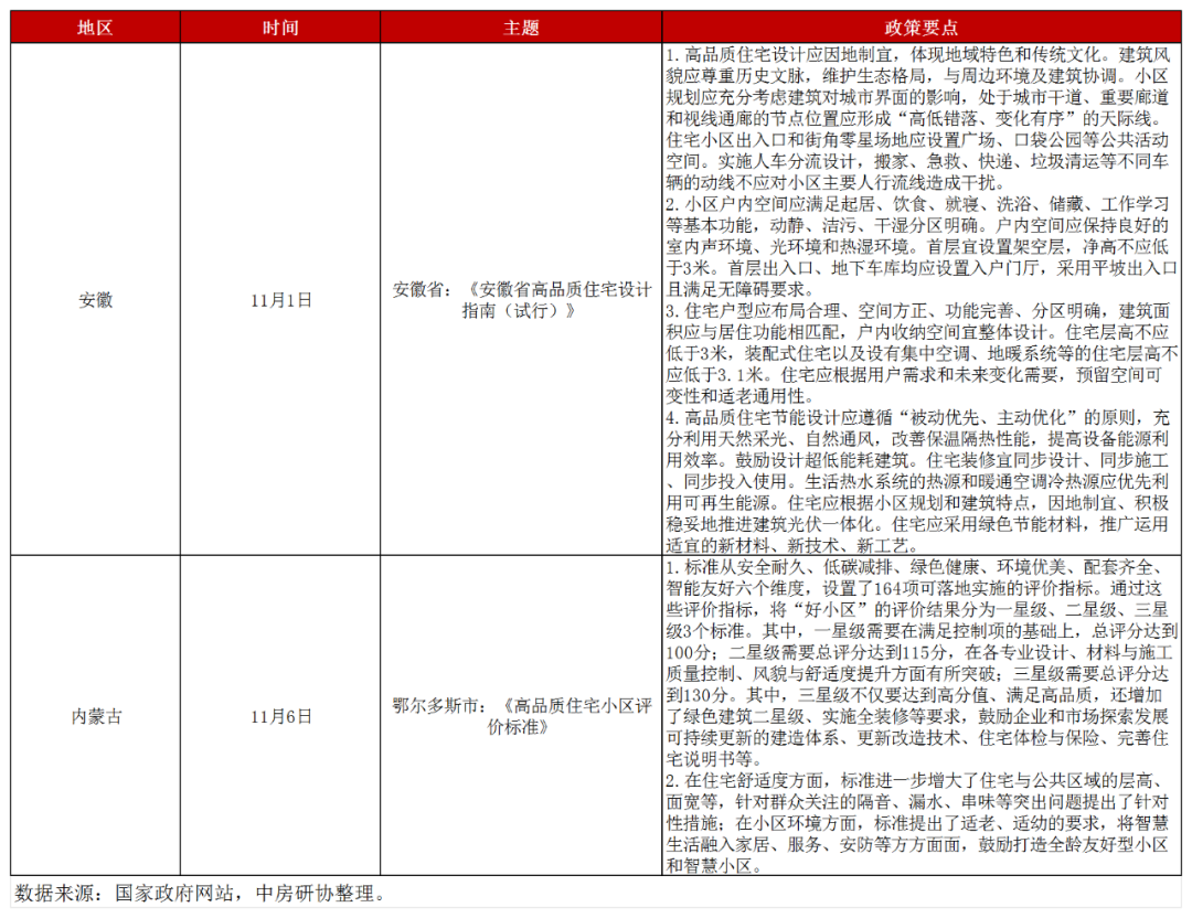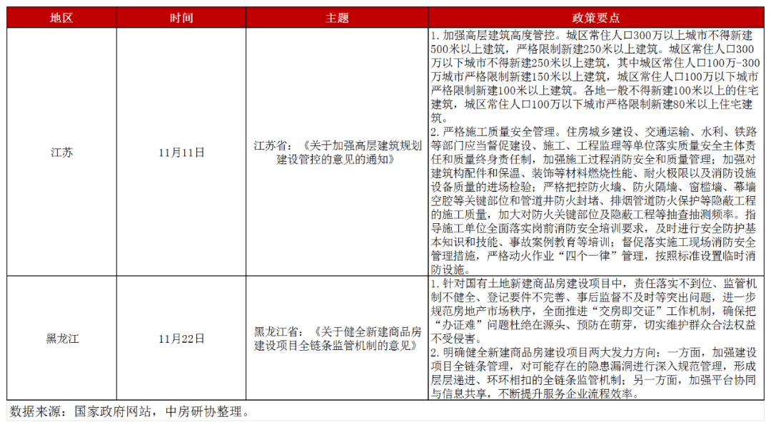 人口人才政策主要涉及放宽落户门槛、发放购房补贴等。典型代表有:东莞市新增稳定居住就业入户事项,明确在东莞市拥有合法产权住宅房屋的本人及配偶可申请入户东莞;哈尔滨队自主创业且年龄在40周岁以下的各类人才(无户籍限制),在9区购买首套或第二套新建商品住房的,在取得《不动产权证书》后,按照博士毕业生10万元、硕士毕业生5万元、本科毕业生及大中专毕业生(含技工院校预备技师班、高级工班毕业生)3万元的标准,给予一次性购房补贴;鄂州对高层次人才发放5折购房券,对人才强企、人才池、引进生人才,按全日制博士(正高级职称)最高12万元,全日制硕士(副高级职称、高级技师)最高8万元,全日制本科(中级职称、技师)最高6万元,全日制大专(高级工)最高4万元的标准,发放一次性购房券;杭州市西湖区在落实市级A-D类高层次人才购房补贴基础上,对符合条件的E类高层次人才购买西湖区新建商品住宅,给予15万元购房补贴等。中性政策主要涉及加强保障性住房建设筹集和运营管理、制定高品质住宅评价标准等中性政策主要涉及加强保障性住房建设筹集和运营管理、制定高品质住宅评价标准等。典型代表有:郑州、广州发布征集收购存量商品房用作保障性住房项目的公告;兰州市兰州新区发布配租型保障房建设管理办法,其中,进一步放宽保障性租赁住房申请条件,取消申请人具有新区户籍或居住证,且在新区稳定就业3个月以上,或自主创业、企业在新区注册登记3个月以上的条件,调整为新区城市居民、自由职业者,城乡机关、企事业单位职工,进城务工农民等在新区工作、生活且未享受保障性住房政策的人员均可申请保障性租赁住房;广州审议通过配售型保障房管理办法,明确配售型保障房筹措方式、户型面积、申购条件及销售模式等内容;鄂尔多斯市和安徽省则对高品质住房提出具体设计要求或评价标准等。紧缩性调控主要涉及高层建筑规划建设管控和商品房项目全链条监管机制建设健全紧缩性政策主要涉及高层建筑规划建设管控和商品房项目全链条监管机制建设健全。典型代表有:江苏省加强高层建筑规划建设管控,明确城区常住人口300万以上城市不得新建500米以上建筑,严格限制新建250米以上建筑,城区常住人口300万以下城市不得新建250米以上建筑,城区常住人口100万以下城市严格限制新建100米以上建筑;黑龙江省提出健全新房建设项目全链条监管机制,一方面,加强建设项目全链条管理,对可能存在的隐患漏洞进行深入规范管理,形成层层递进、环环相扣的全链条监管机制;另一方面,加强平台协同与信息共享,不断提升服务企业流程效率等。11月重要事项复盘