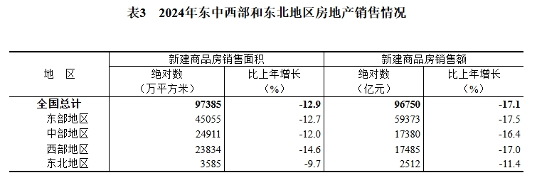 2024年,房地产开发企业房屋施工面积733247万平方米,比上年下降12.7%。其中,住宅施工面积513330万平方米,下降13.1%。房屋新开工面积73893万平方米,下降23.0%。其中,住宅新开工面积53660万平方米,下降23.0%。房屋竣工面积73743万平方米,下降27.7%。其中,住宅竣工面积53741万平方米,下降27.4%。?2024年,新建商品房销售面积97385万平方米,比上年下降12.9%,其中住宅销售面积下降14.1%。新建商品房销售额96750亿元,下降17.1%,其中住宅销售额下降17.6%。