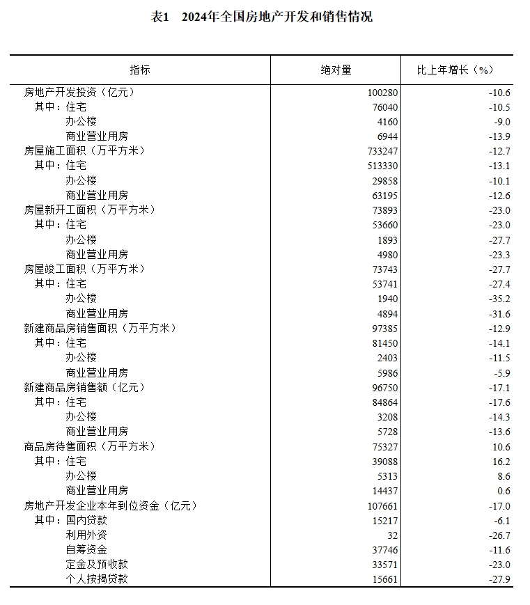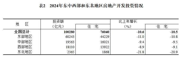 2024年,全国房地产开发投资100280亿元,比上年下降10.6%(按可比口径计算,详见附注6);其中,住宅投资76040亿元,下降10.5%。